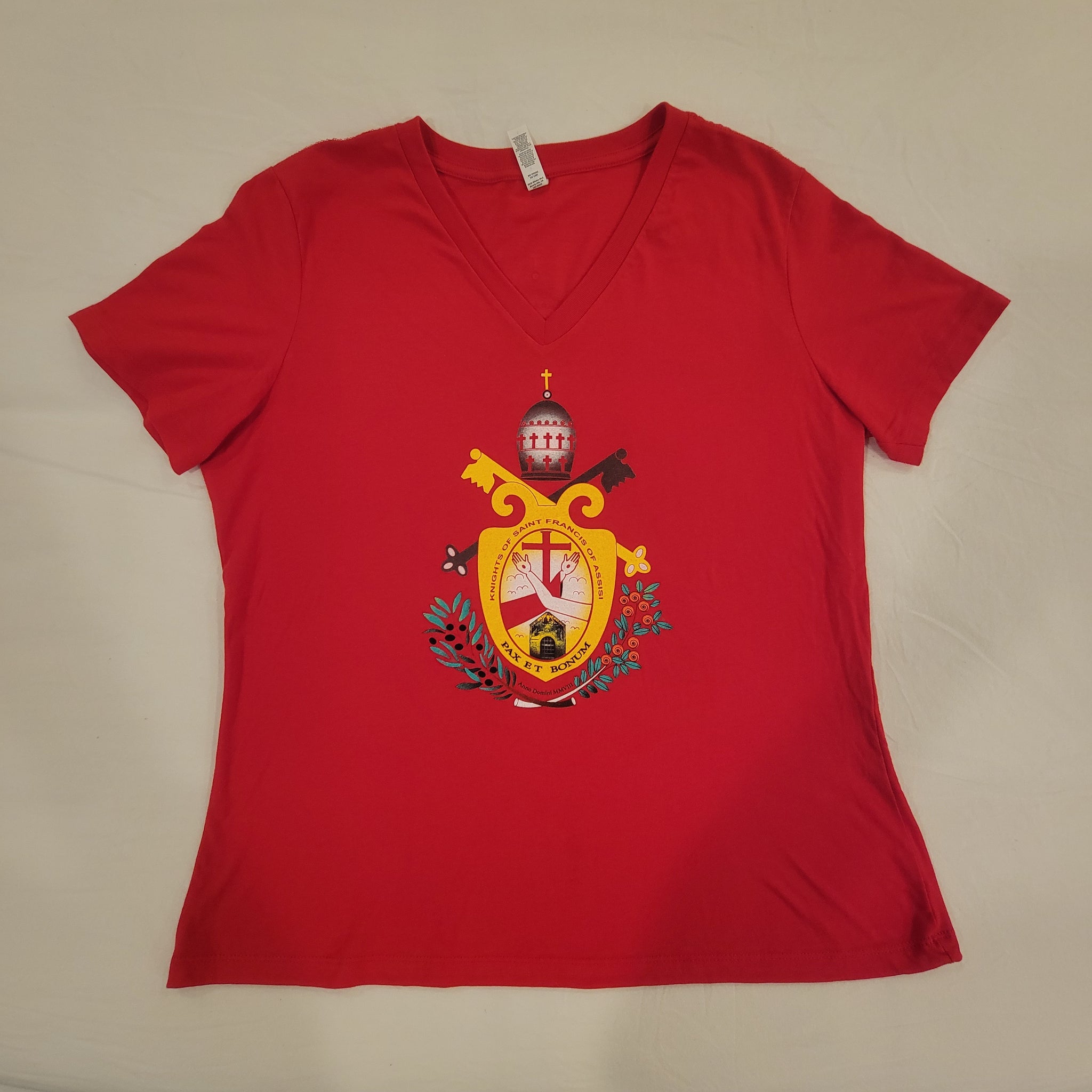 Show your love and devotion to St. Francis by wearing this v-neck, short sleeve, t-shirt made of 100% cotton. This lightweight shirt in red, bears the crest of the Knights of St. Francis of the Porziuncola Nuova on the front and back. Women’s sizes are fitted through the bodice and sleeves. Men’s sizes are slightly longer. Fit runs small, we suggest ordering up a size. Locally made.